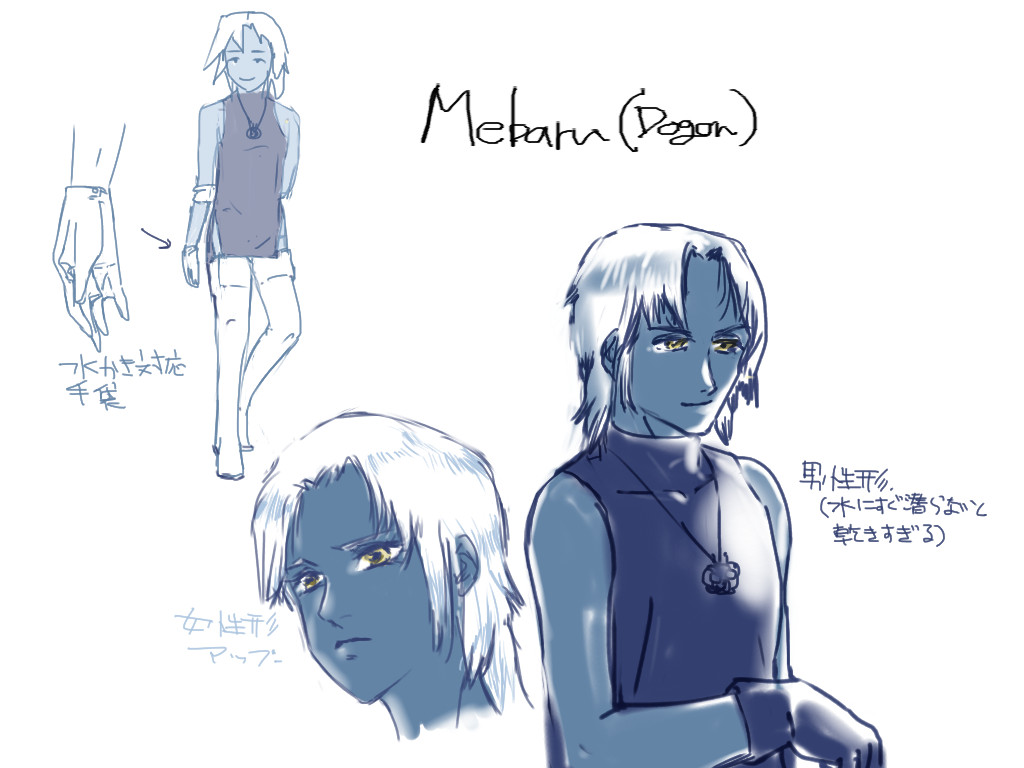 メバルいう処の≪小さく賢い生き物≫で海のともだち。魚を二足歩行形態に近づけたらこういう感じ、という魚ヒト属。集団行動で、巫術師(ウーシューシー、シャーマンのこと)を頂点とする社会を持つ。白から青系銀の鱗をもち、主武器は白い珊瑚を加工した三叉槍。シャーマンは赤珊瑚をつないで首から肩、胸の正面を覆う大きな飾りをつける。